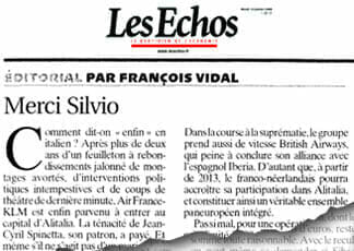 «Non male per un’operazione il cui prezzo, 300 milioni, resta tutto sommato ragionevole», scrive Les Echos. «Ci si può persino chiedere se Silvio Berlusconi non ha reso un insigne servizio ad Air France-Klm nell’aprile 2008, quando ha fatto fallire il progetto di acquisto di Alitalia per 1,5 miliardi di euro in nome dell'”italianità”. Dopo tutto, la compagnia con la quale si è fidanzata Air France-Klm ha già operato buona parte della sua ristrutturazione. Non è più il vettore malato che perdeva 1 milione di euro al giorno, ma un gruppo depurato dai suoi debiti e rafforzato dopo la fusione con il suo rivale Air One». Merci Silvio. A Palazzo Chigi c’è ancora una merchant bank, solo un pò più miope.