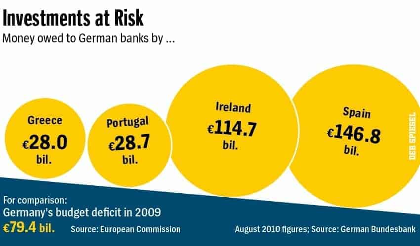 Anche di questo vi abbiamo allertato in tempi non sospetti: le banche tedesche si sono riempite di titoli a rendimento elevato e fallacemente reputati solidi, vuoi perché appartenenti ad emittenti sovrani dell’Unione europea, vuoi perché beneficiati dalla illusoria tripla A erogata dalle agenzie di rating su prodotti strutturati. Nella infografica qui sotto, tratta da Der Spiegel, il totale dei crediti della Germania verso i quattro PIGS, aggiornato ad agosto di quest’anno.