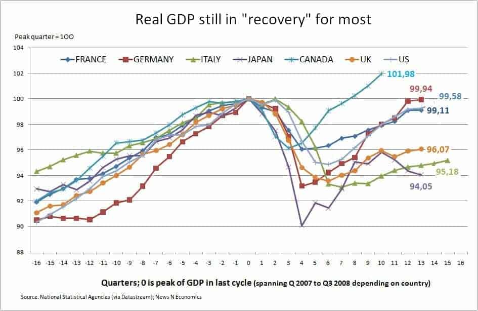 Fatto pari a 100 il livello di “picco” del Pil per ogni paese (asse delle ordinate) ed il numero di trimestri trascorsi da quel picco (asse delle ascisse), si può osservare che, nell’ambito del G7, solo il Canada ha completamente recuperato il buco di attività, mentre le maglie nere sono Italia e Giappone. Solo che quest’ultimo è ripiombato in ultima posizione a causa della catastrofe di marzo.