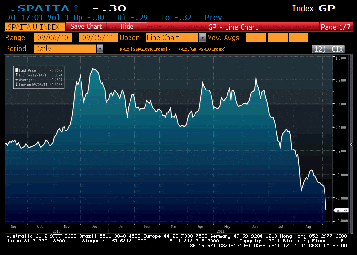 Non è un caso che il nostro paese, da ormai tre mesi, stia sistematicamente facendo peggio della Spagna, come potete osservare qui sotto: le metriche sono peggiori, la performance economica quasi simile, ma lo stock di debito nettamente maggiore, ed una manovra correttiva che non corregge, figlia com’è di una paralisi corporativa terminale. Facendo due più due, ai mercati è bastato assai poco per dare corpo agli scenari peggiori: un downgrade imminente dell’Italia, che è già sotto osservazione negativa dalle agenzie di rating; la possibilità che la Bce, ormai apertamente sfidata dai mercati, getti la spugna degli acquisti di nostri titoli, cosa peraltro assai probabile. E non che non si sapesse da subito, visto i precedenti degli altri paesi, ed a maggior ragione per l’Italia.