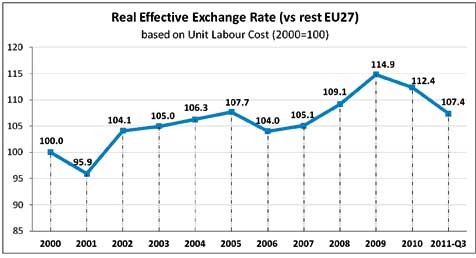 Poi, la competitività. Secondo la Commissione europea, negli ultimi due anni, il tasso di cambio reale effettivo (misurato in termini di costo del lavoro per unità di prodotto) della Grecia è migliorato di circa 7 punti percentuali rispetto agli altri 26 paesi dell’Unione europea. Non male per un paese che trascina i piedi, no? Peccato che la base di export greco sia inesistente, altrimenti avremmo avuto un mini-boom in mezzo al Mediterraneo.