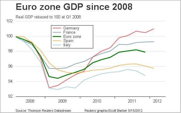 Per la serie “val più un’immagine”, nel grafico dell’ottimo Scotty Barber di Thomson Reuters l’andamento del Pil dei maggiori paesi dell’Eurozona, ribasato a 100 dal primo trimestre 2008. Il nostro paese non riesce a sfuggire al campo gravitazionale della recessione auto-inflitta dalla violenza del consolidamento fiscale imposto dalla fretta tedesca. Tradotto: ‘gna famo, per ora. Cliccare per ingrandire.