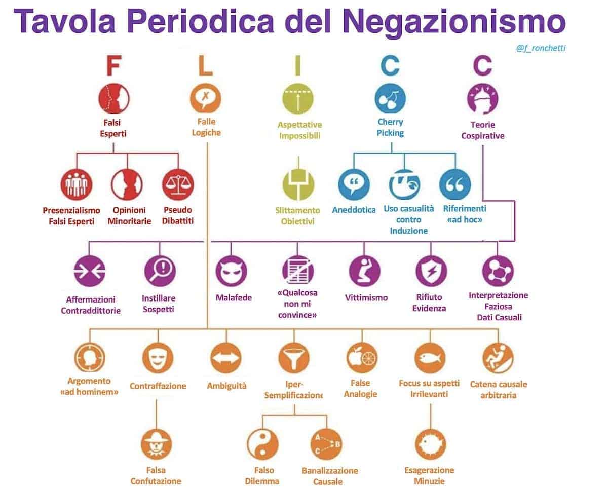 Se siete interessati al grande filone della fallacia logica e ai suoi cascami, trovo utile segnalarvi la Tavola Periodica del Negazionismo, tradotta da Federico Ronchetti, fisico nucleare italiano del CERN. Vedo che in molti l’hanno già erroneamente definita “strumento di repressione del pensiero critico”. Confermando che, se uno il metodo scientifico non ce l’ha, non se lo può dare. E pure la cultura che tale metodo produce, soprattutto.