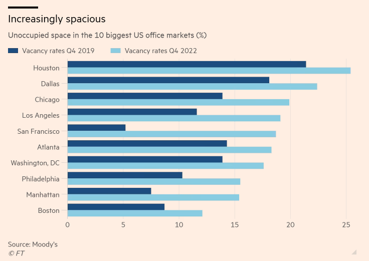 L’immobiliare commerciale soffre per il combinato disposto di tassi in crescita, che rendono oneroso l’accesso al credito, ma anche per il forte aumento di spazi non locati che la diffusione dello smart working ha causato. Un fenomeno che appare destinato a restare ed approfondirsi, come mostrano le stime di Moody’s sugli spazi commerciali sfitti nei maggiori venticinque mercati immobiliari urbani statunitensi. A San Francisco in soli tre anni (dal 2019 al 2022), gli spazi commerciali sfitti sono aumentati dal 5% al 19% del totale. Ma le cose vanno male anche in Texas, che pure negli ultimi anni ha visto la relocation di molte e spesso iconiche imprese californiane.