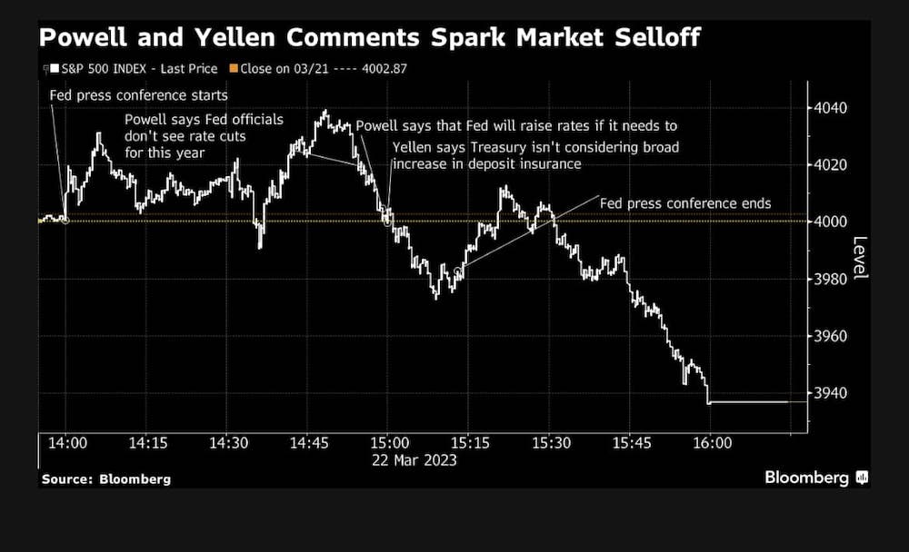 Torniamo all’ultima mezz’ora del mercato di ieri a Wall Street. Che sia stata Yellen, col rifiuto di garanzie in bianco sui depositi, oppure Powell, col suo “il mercato ancora non coglie la stretta finanziaria ed è ancora troppo caro”, il tuffo delle quotazioni ci sta tutto.