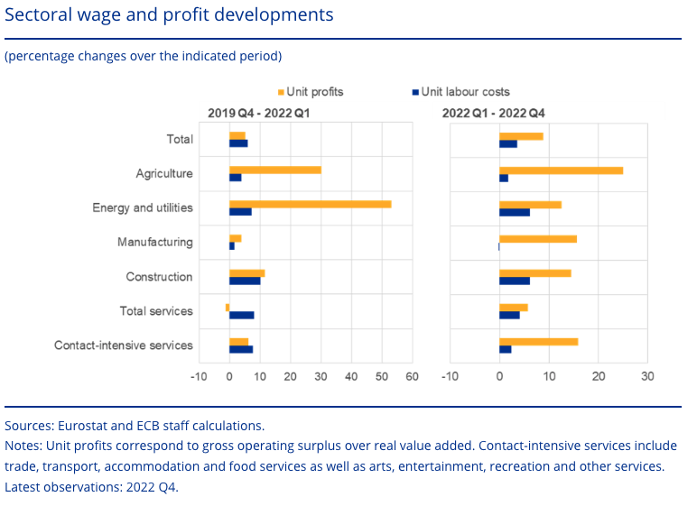 Questi dati causano comprensibili polemiche politiche, e la richiesta di intervenire su quelli che diventano, per vox populi, degli extraprofitti. Definizione molto scivolosa perché non specifica la misura di profitto “normale” a partire dal quale misurare gli “extra”. Il post del blog della Bce, su dati Eurostat, tenta poi di identificare i settori dove la dinamica dei profitti eccede quella dei salari, e su quale arco temporale.