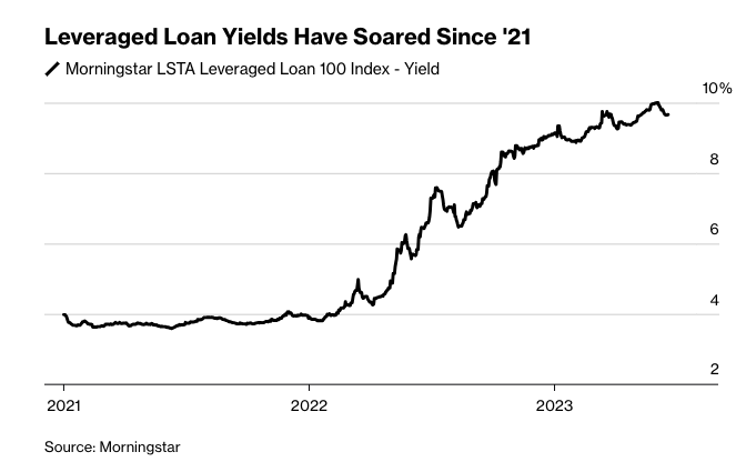 Negli Stati Uniti, il tasso medio sui leveraged loans è schizzato da poco meno del 4% di inizio 2021 al 10% attuale, secondo un indice calcolato da Morningstar.