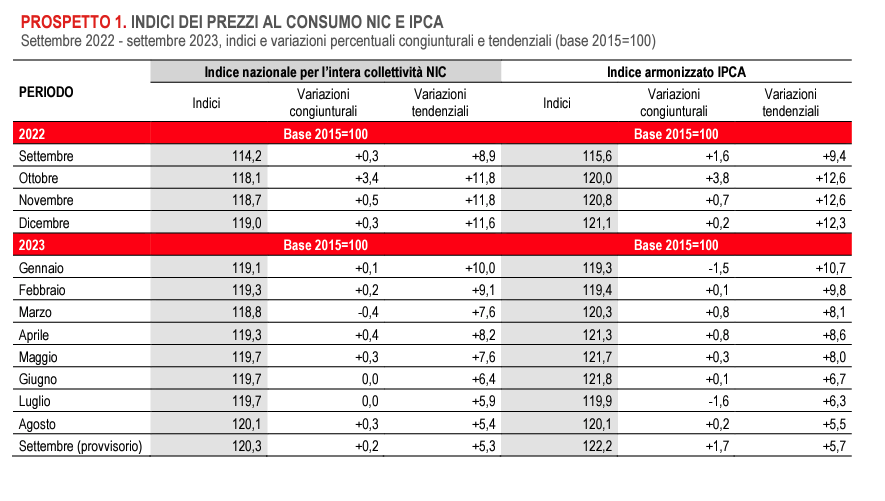 Aggiornamento del 31 ottobre: anche meglio del previsto, con tendenziale euro-armonizzato a +1,9% e nazionale intera collettività a +1,8%. L’inflazione di fondo, al netto delle componenti energia e alimentari freschi, decelera da +4,6% a +4,2%. Quella dei beni passa da +6% a +0,1% tendenziale, mentre quella dei servizi resta stabile al +4,1% tendenziale.