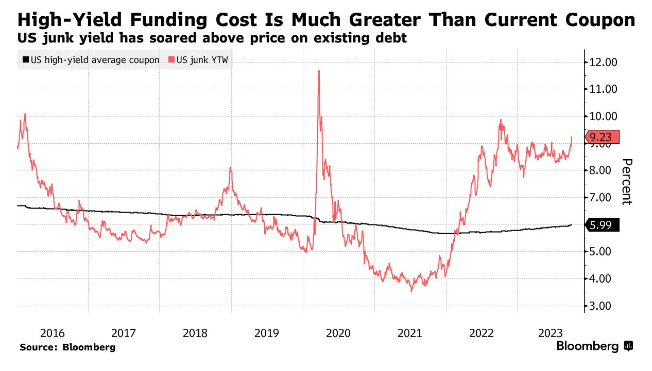 Prendete, nel settore privato, il fenomeno delle obbligazioni high yield, dette anche “spazzatura”. Giorni addietro, Bloomberg ha stimato che sul mercato ci sono 425 miliardi di dollari di debito junk attesi scadere prima della fine del 2025. Oggi, i rendimenti di mercato per quel tipo di debito sono almeno tre punti percentuali sopra la cedola media con cui quel debito è stato emesso, negli anni del denaro facilissimo.
