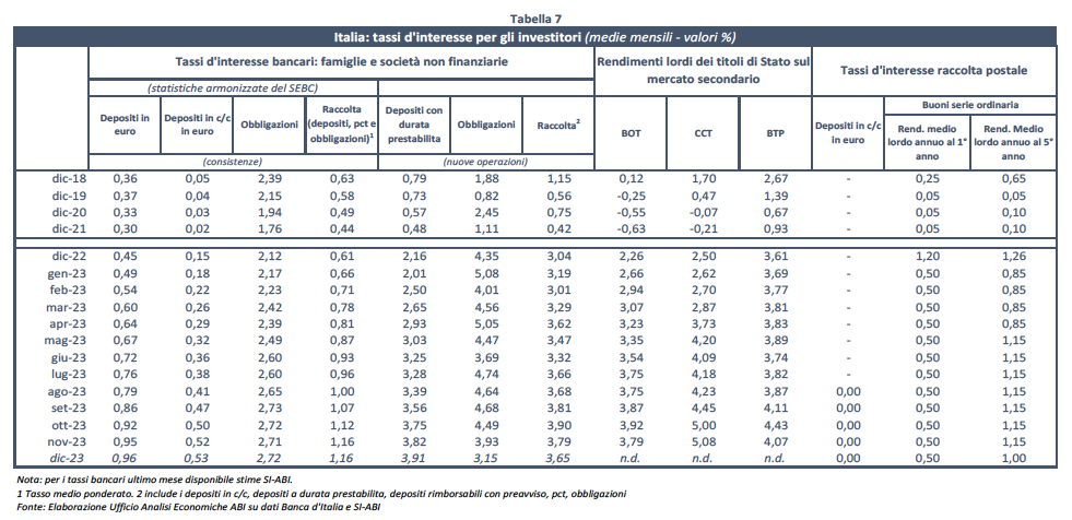 Perbacco. Premesso che la remunerazione dei depositi liberi è aumentata ovunque in Europa, in conseguenza del rialzo dell’intera struttura dei tassi, guardiamo i dati di Abi. Che sono indifferenziati per tipologia di depositante ma forniscono comunque una base di riferimento. Ebbene, la media dei tassi sugli impieghi è passata da 4,49% di agosto a 4,76% di dicembre. Se compariamo questi dati con quelli sulla remunerazione media della raccolta, otteniamo l’indicazione di una componente del margine di interesse per le banche, cioè la differenza tra costo medio degli impieghi e quello della raccolta.