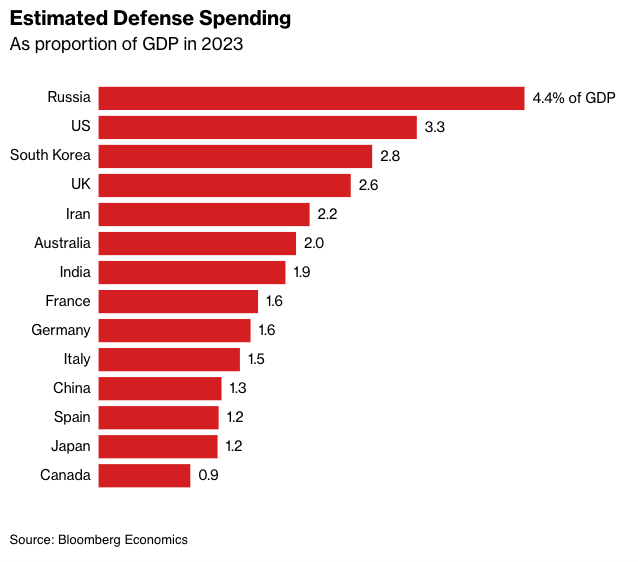 Sempre secondo Bloomberg Economics, per Stati Uniti e intero G7, a dieci anni, il fabbisogno aggiuntivo potrebbe toccare i 10 mila miliardi di dollari. E la tendenza al riarmo è globale, anche se la cronaca ha portato a focalizzarsi sulle due situazioni di guerra guerreggiata, Ucraina e Gaza. Ma il riarmo è in essere: soprattutto in Cina, dove la spesa per la difesa, secondo un dato ufficiale che è considerato una forte sottostima degli esborsi effettivi, quest’anno crescerà del 7,2 per cento, massimo dell’ultimo lustro.