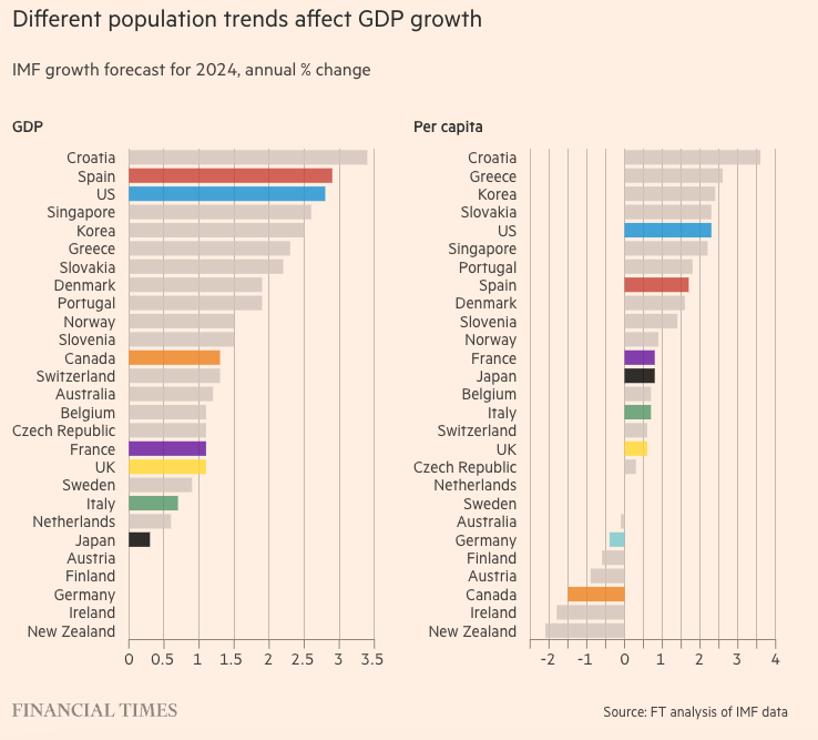 Sul tema torna il Financial Times con un articolo a firma di Valentina Romei, il cui titolo è esplicativo: “Come la demografia può distorcere le narrazioni economiche“. L’esempio è fornito dal “miracolo economico” della Spagna. Lo so, l’espressione è iperbolica, ma se fosse l’Italia ad avere simili tassi di crescita, avremmo caroselli per strada giorno e notte e celebrazioni ininterrotte sui media più o meno indipendenti, oltre a richiami all’impero romano e alle nostre geniali radici.