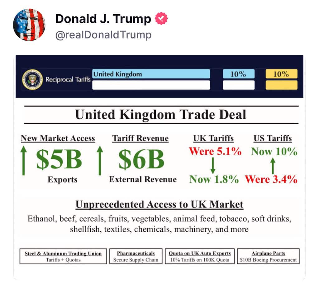 Perdonate l’irriverenza ma la giornata di ieri, ottantesimo anniversario della Victory in Europe, ha dato al mondo, o a una parte di esso, sia il nuovo vescovo di Roma che il primo “accordo” commerciale dopo la proclamazione del Liberation Day da parte di Donald Trump, lo scorso 2 aprile. Pareva dovesse essere quello con l’India ma la crisi col Pakistan ha rinviato l’evento. E così, l’onore è toccato al Regno Unito, paese il cui premier, Keir Starmer, ha da subito deciso di trattare con Trump in modo molto tranquillo e non antagonistico, perseguendo quell’agognato trattato di libero scambio sfuggito agli ultimi primi ministri britannici, che attendevano inutilmente il lieto evento ribadendo la “special relationship” con la ex colonia.