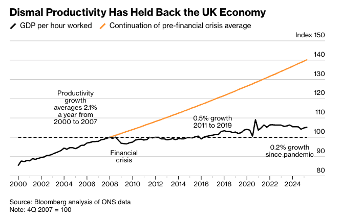 Nel primo trimestre del 2025, la produttività misurata da output per lavoratore è stata negativa: secondo l’Ufficio nazionale di statistica c’è stata una diminuzione dello 0,7 per cento rispetto allo stesso trimestre dell’anno precedente. La produttività del Regno Unito è inferiore a quella di Germania, Francia e Stati Uniti nei sette principali paesi industrializzati — all’incirca in linea con Italia e Canada e davanti al Giappone. Il “limite di velocità” di un’economia, al di sopra del quale la crescita diventa inflazionistica, è determinato dalla produttività e dall’offerta di lavoro. Alti livelli di migrazione dal 2010 hanno sostenuto il tasso di crescita del Regno Unito, mascherando la pessima performance produttiva. Una lunga carenza di investimenti da parte delle imprese e del governo è stata additata come causa della scarsa crescita della produttività dalla crisi finanziaria del 2008.