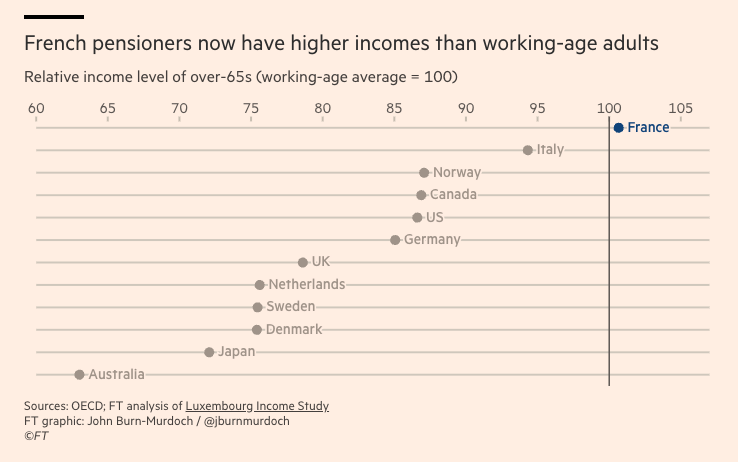 In Francia le cose vanno anche peggio: i pensionati transalpini ricevono mediamente assegni pensionistici più elevati rispetto a quelli degli altri paesi occidentali, e iniziano a percepirli molti anni prima. Il risultato è che i pensionati francesi hanno redditi medi più alti della popolazione attiva, una caratteristica unica a livello internazionale e nella storia francese. Il 28 per cento dei salari francesi va al sostentamento del sistema pensionistico.