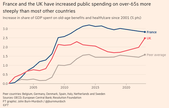 La crisi demografica alimenta la crisi fiscale, non è una rivelazione scioccante né inedita. Il problema è che, in molti paesi europei, non solo il tema non è stato affrontato in modo strutturale ma nel corso del tempo sono state poste le basi per amplificare il trauma di finanza pubblica. Due plastici esempi sono forniti da un articolo del Chief data reporter del Financial Times, John Burn-Murdoch, sulla dinamica della spesa pensionistica, sanitaria e sociale in Regno Unito e Francia.