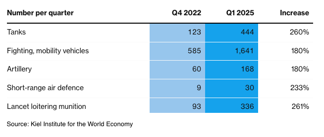 L’aumento di produzione militare russa è stato impressionante, ricorda l’articolo. Prima dell’invasione dell’Ucraina, nel 2022, la previsione era di consegnare a un anno circa 400 veicoli corazzati. Ora siamo a 10 volte tanto. L’innovazione ha portato a linee di produzione per droni, dopo aver inizialmente fatto affidamento su forniture iraniane. Lo scorso anno, la produzione domestica di droni è stata di 1,5 milioni di unità, contro i 140.000 del 2023.