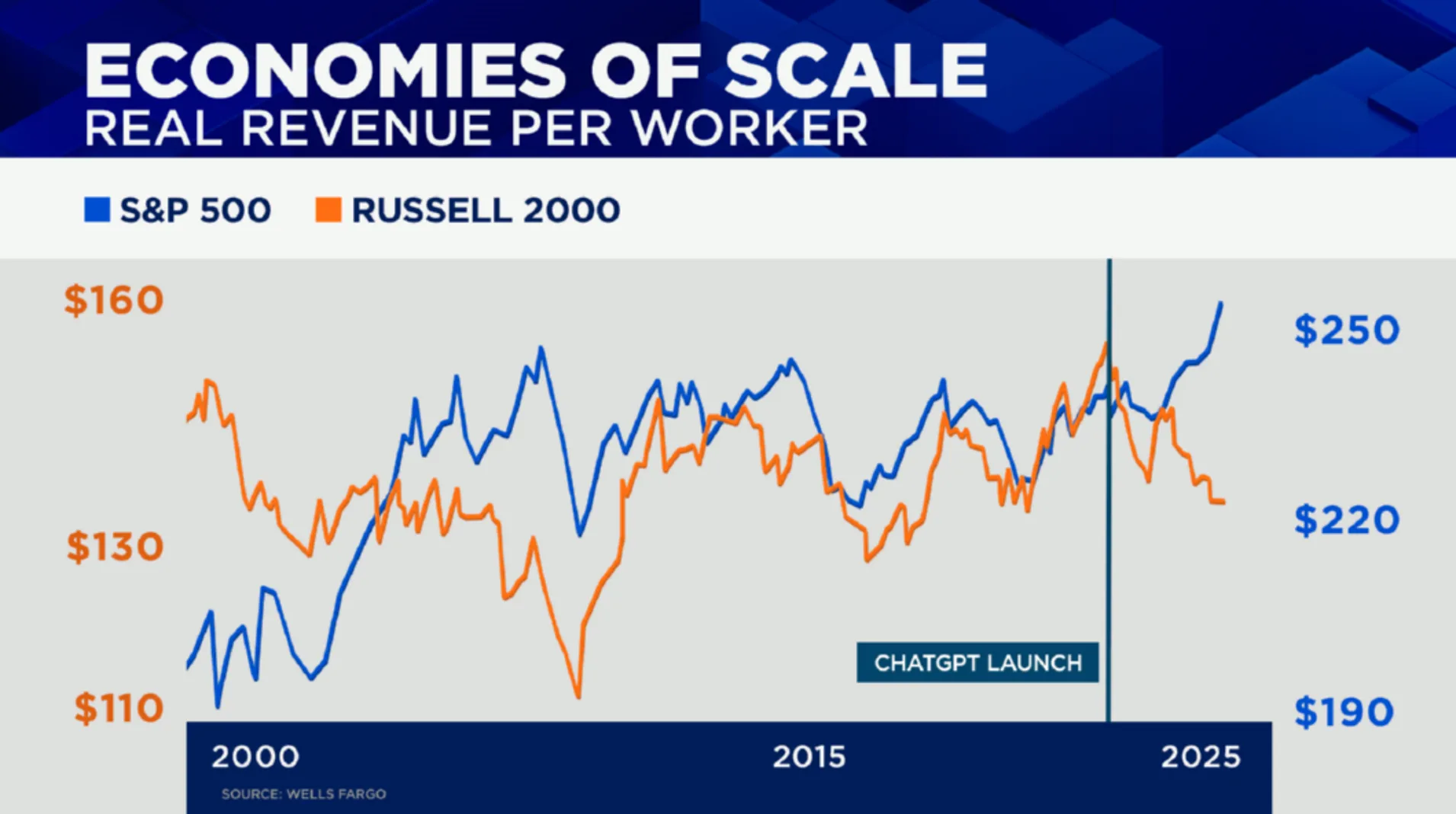 Dal lancio di ChatGPT di OpenAI, nel 2022, le aziende a grande capitalizzazione stanno registrando costanti guadagni di produttività legati all’AI, mentre le aziende a piccola capitalizzazione starebbero declinando sotto questa metrica. Dal lancio di ChatGPT, nel 2022, l’indice S&P 500 delle aziende a grande capitalizzazione è aumentato del 74 per cento mentre iol Russell 2000, quello delle small cap di solo il 39 per cento.