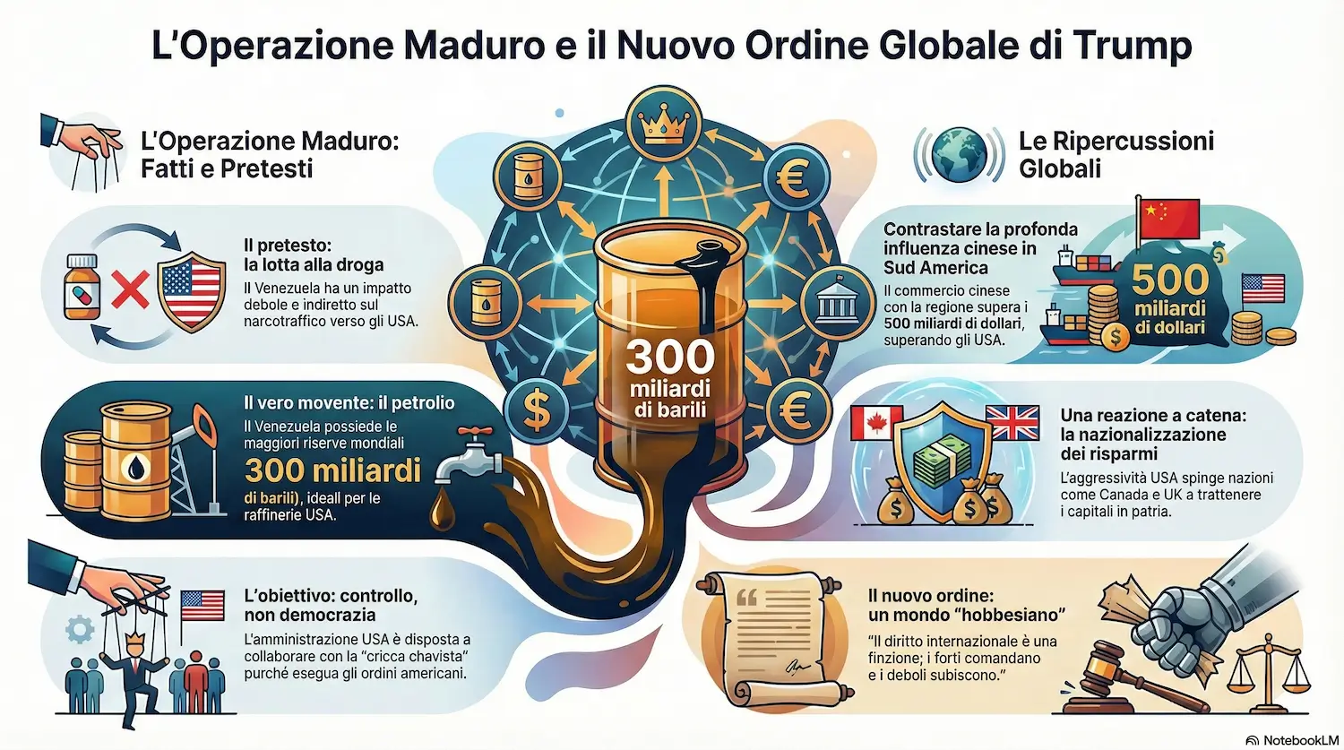 - Trump ha preso il Venezuela, ricco di riserve petrolifere “accertate” da Hugo Chavez, ma cacciare la Cina dal Sud America sarà difficile. Pechino ha investito 180 miliardi nella regione, dominando porti, energia e commercio. Maduro era il frutto più facile;