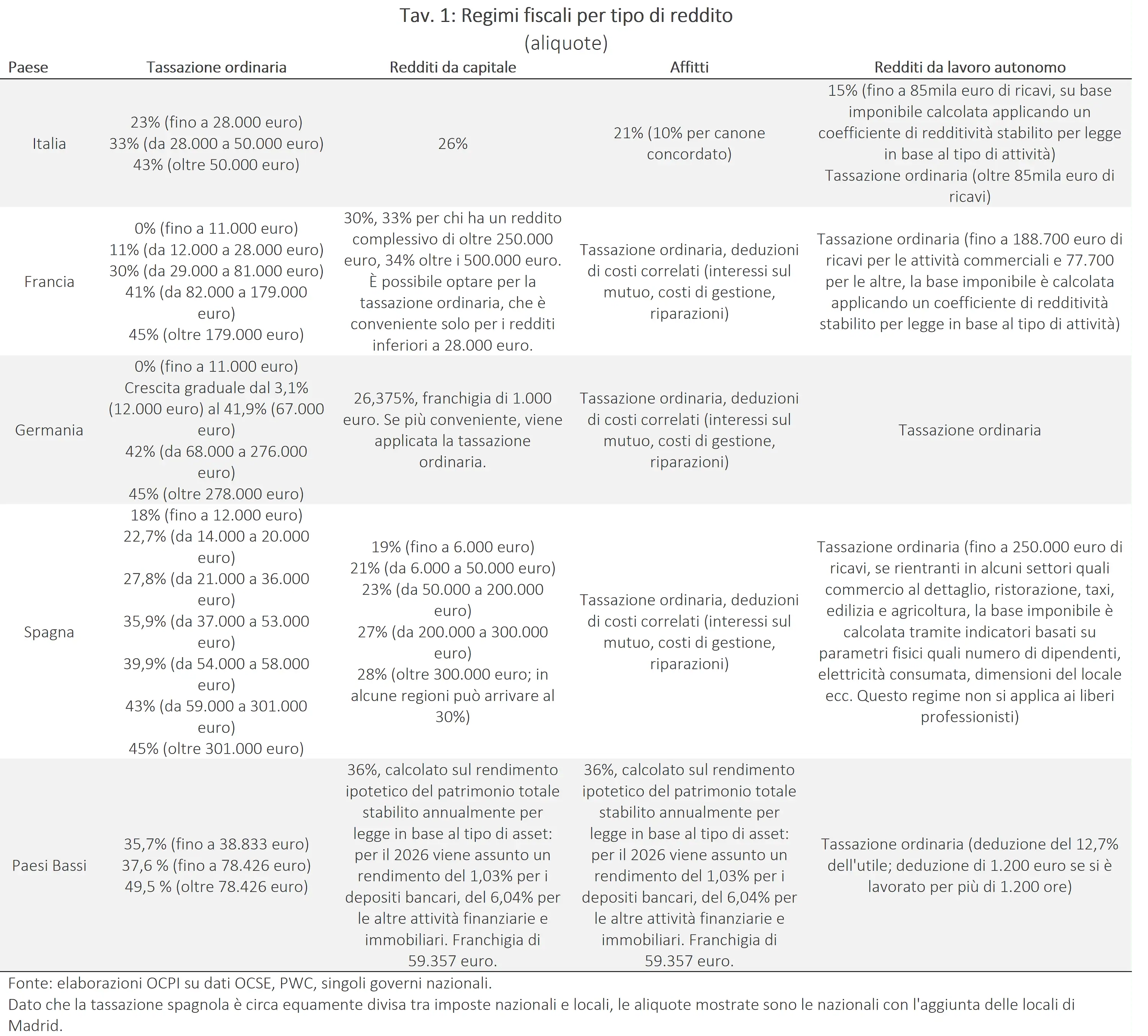 Per i redditi da capitale, che sono quelli più mobili, Francia e Germania hanno cedolari secche rispettivamente del 30 e 26 per cento, quindi siamo allineati. Anche in Spagna i redditi da capitale sono tassati fuori dal regime ordinario: esiste un sistema di cedolari secche, comprese tra il 19 e il 30 per cento, progressive in funzione dei livelli di reddito. In Olanda è più macchinoso: si presume un rendimento teorico (oggi 6,04%) su un insieme di attività finanziarie e immobiliari, e si tassa al 36 per cento la parte che supera una franchigia di circa 59.000 euro. Progressività preservata, sia pure in modo barocco.