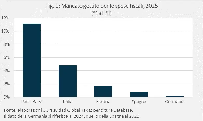Quante sono le tax expenditures italiane, quanto costano e come ci posizionano rispetto ai quattro paesi con cui viene effettuato il confronto? Nel 2025 da noi se ne contavano 575, di cui 166 talmente risibili da avere un gettito “non calcolabile” o irrilevante. La perdita di gettito per il 2025 è stimata in 119 miliardi, il 5,3 per cento del Pil. Quelle che incidono sull’Irpef sono 357, di cui 209 quantificabili. Il mancato gettito? 198 miliardi, pari al 4,8% del Pil.. Se queste tax expenditures fossero eliminate, riportando tutto a Irpef, sarebbe possibile abbattere le aliquote nominali in misura pari a 108 miliardi di euro annui, a parità di altre condizioni.