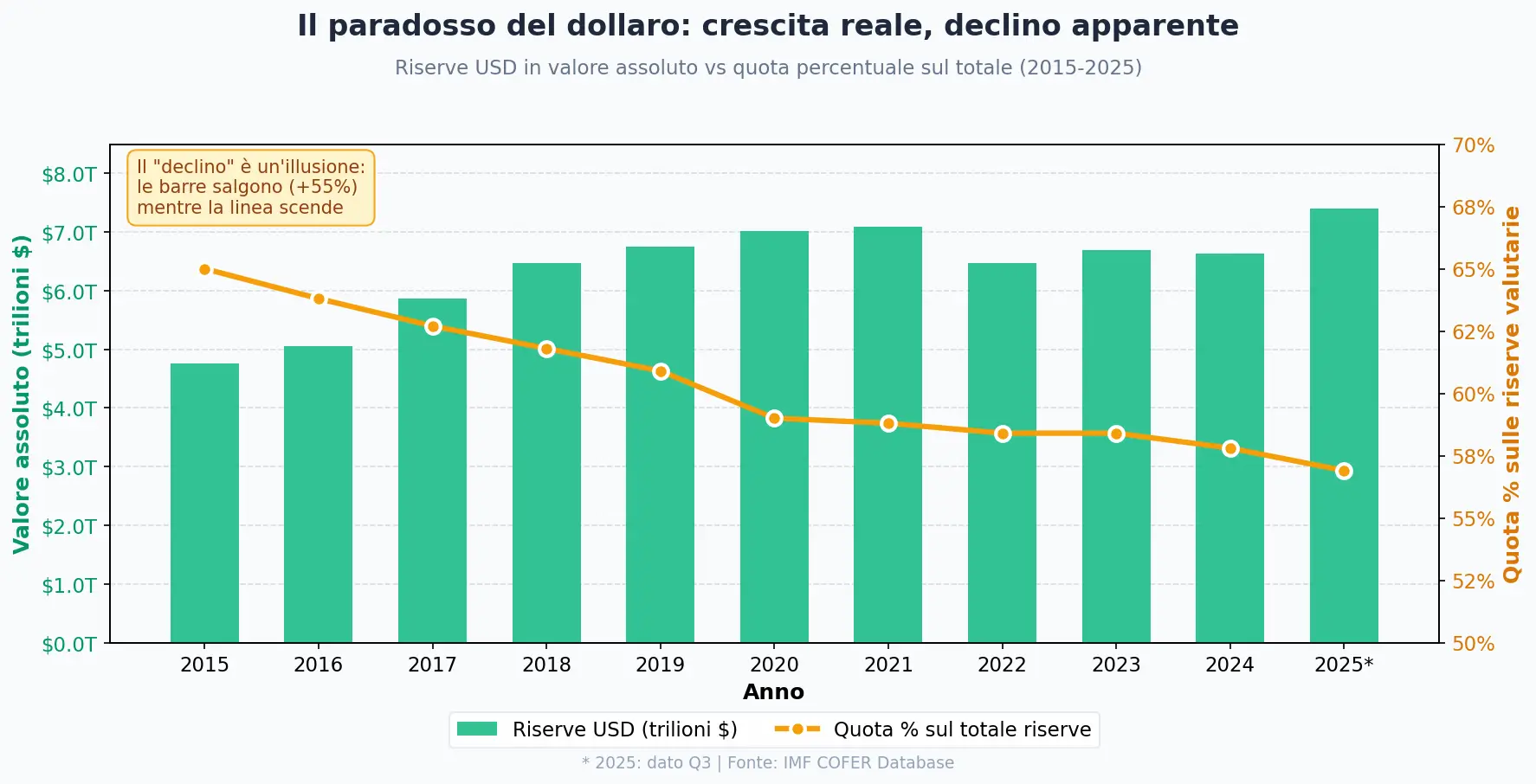 I dati IMF COFER in valore assoluto dimostrano che le riserve globali in dollari USA sono cresciute da $4,76 trilioni nel 2015 a $7,4 trilioni nel 2025, un incremento del 55% che contraddice la narrativa della de-dollarizzazione. Il calo della quota percentuale (dal 65% al 57%) è un fenomeno reale ma largamente spiegabile da fattori meccanici: la rivalutazione dell’oro, i movimenti dei tassi di cambio e la crescita complessiva delle riserve globali. La de-dollarizzazione attiva rimane confinata a Russia, Cina e Turchia, mentre la maggioranza delle banche centrali mondiali ha mantenuto o aumentato le proprie allocazioni in dollari. Per valutare correttamente il ruolo del dollaro nel sistema monetario internazionale, l’analisi dei valori assoluti è metodologicamente superiore all’osservazione delle sole quote percentuali.