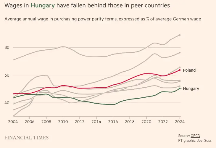 L’economia ungherese dipende dal capitale estero e dalla manifattura a basso valore aggiunto — principalmente l’assemblaggio di auto tedesche. In sedici anni di governo Orbán non vi è stato alcun significativo restringimento del divario di produttività tra imprese nazionali e straniere. L’oligarchizzazione dell’economia, il sistema clientelare degli appalti pubblici e la politicizzazione delle istituzioni hanno ulteriormente compresso concorrenza e innovazione.
